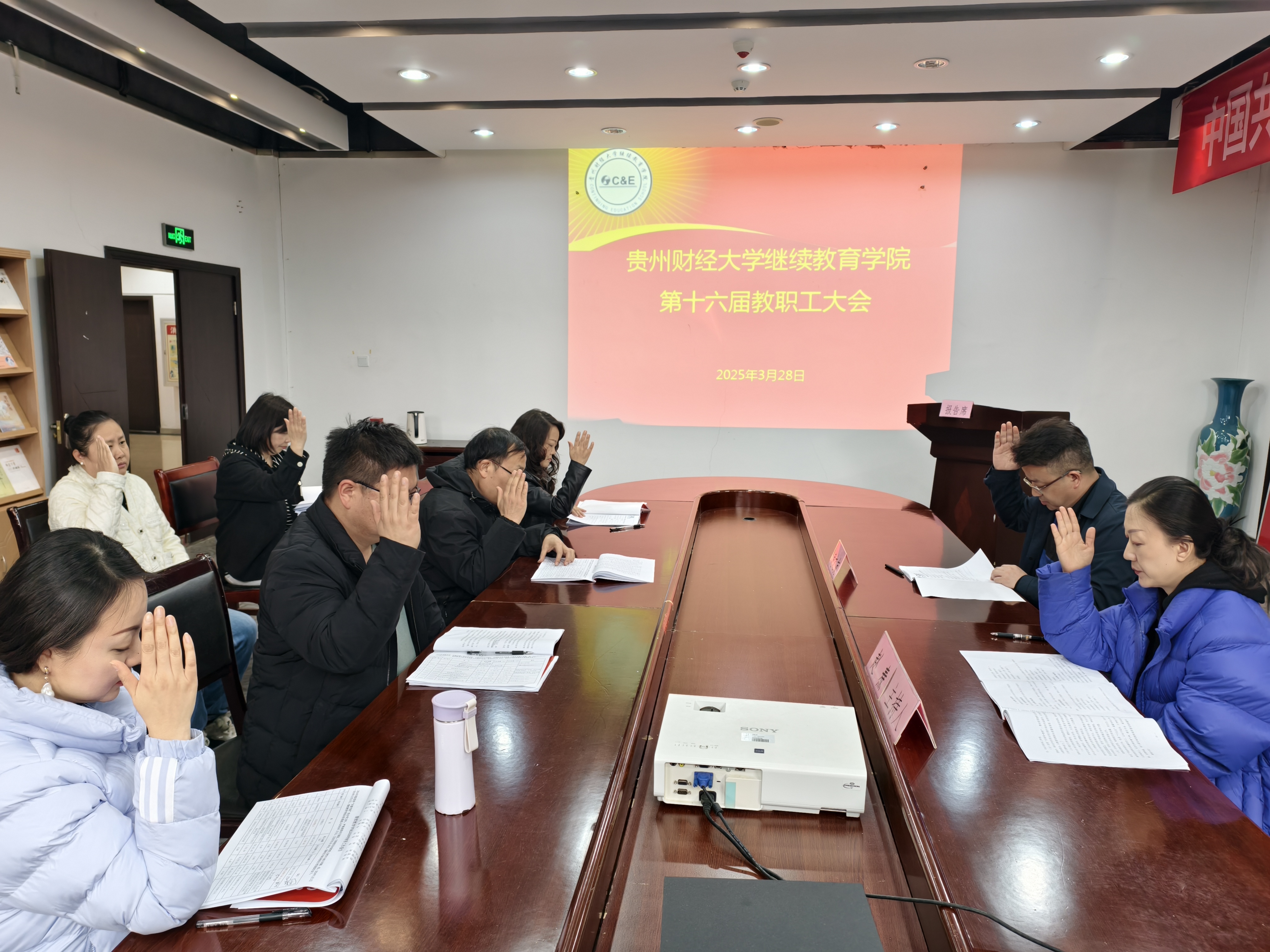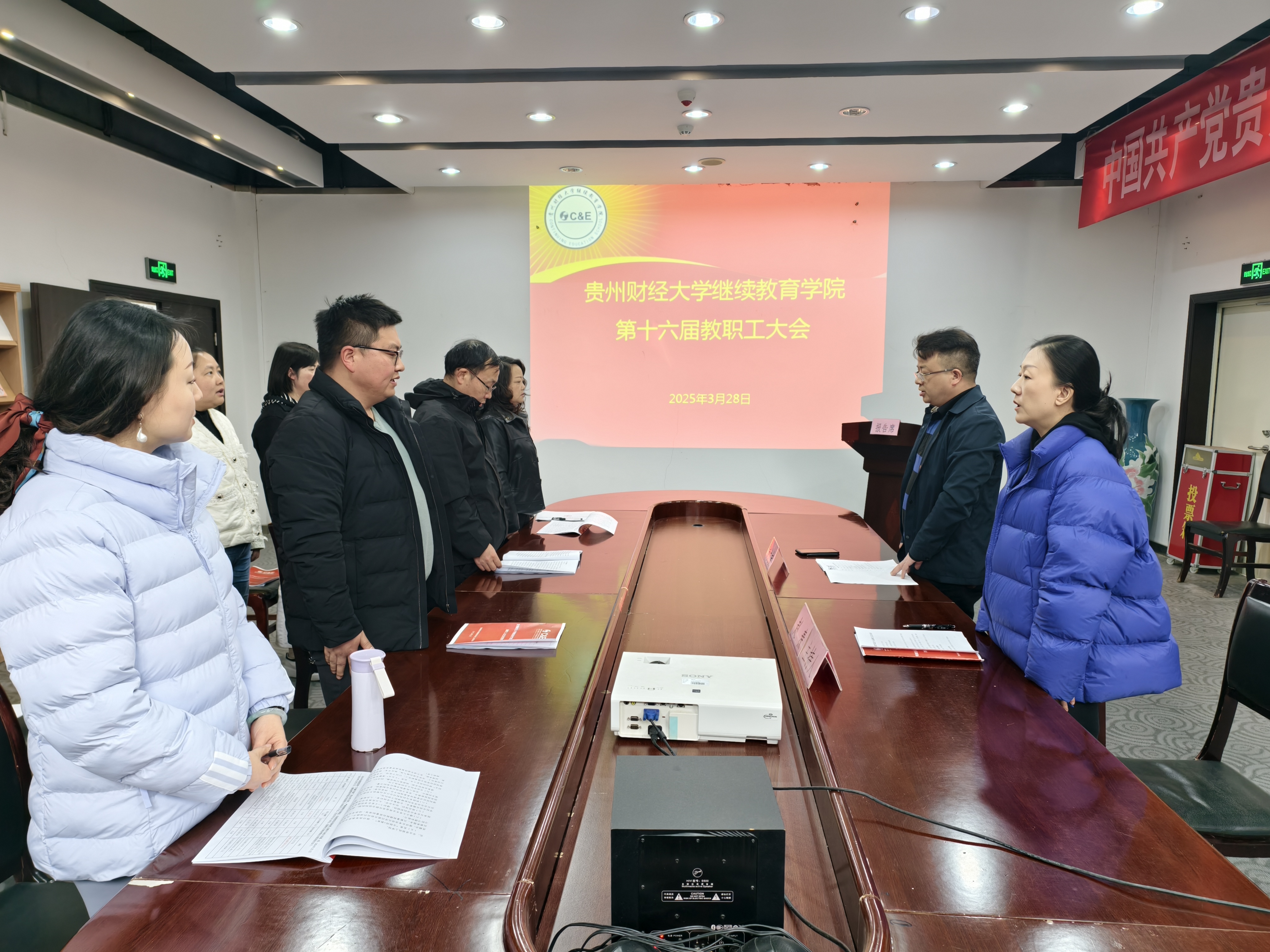 上午10时,会议开始,全场起立,奏唱国歌,mjm世界杯官网第十六届教职工大会正式开幕。